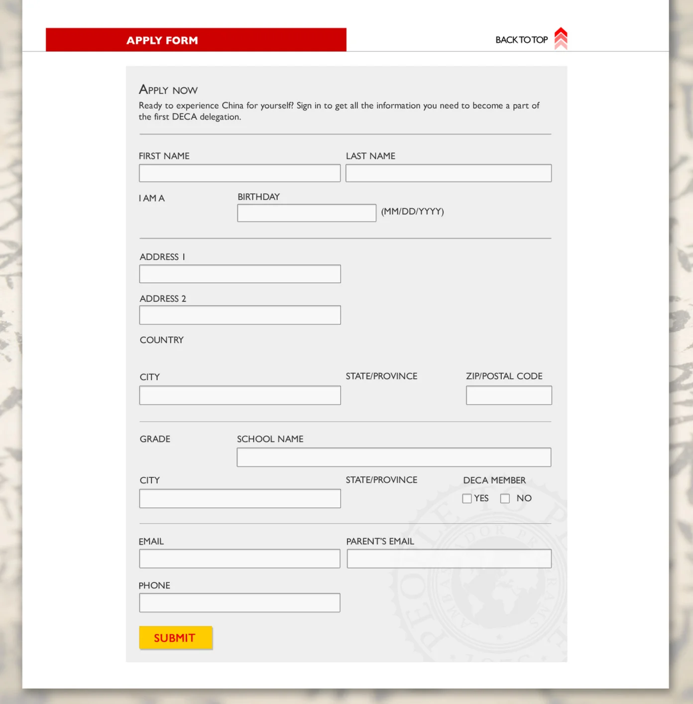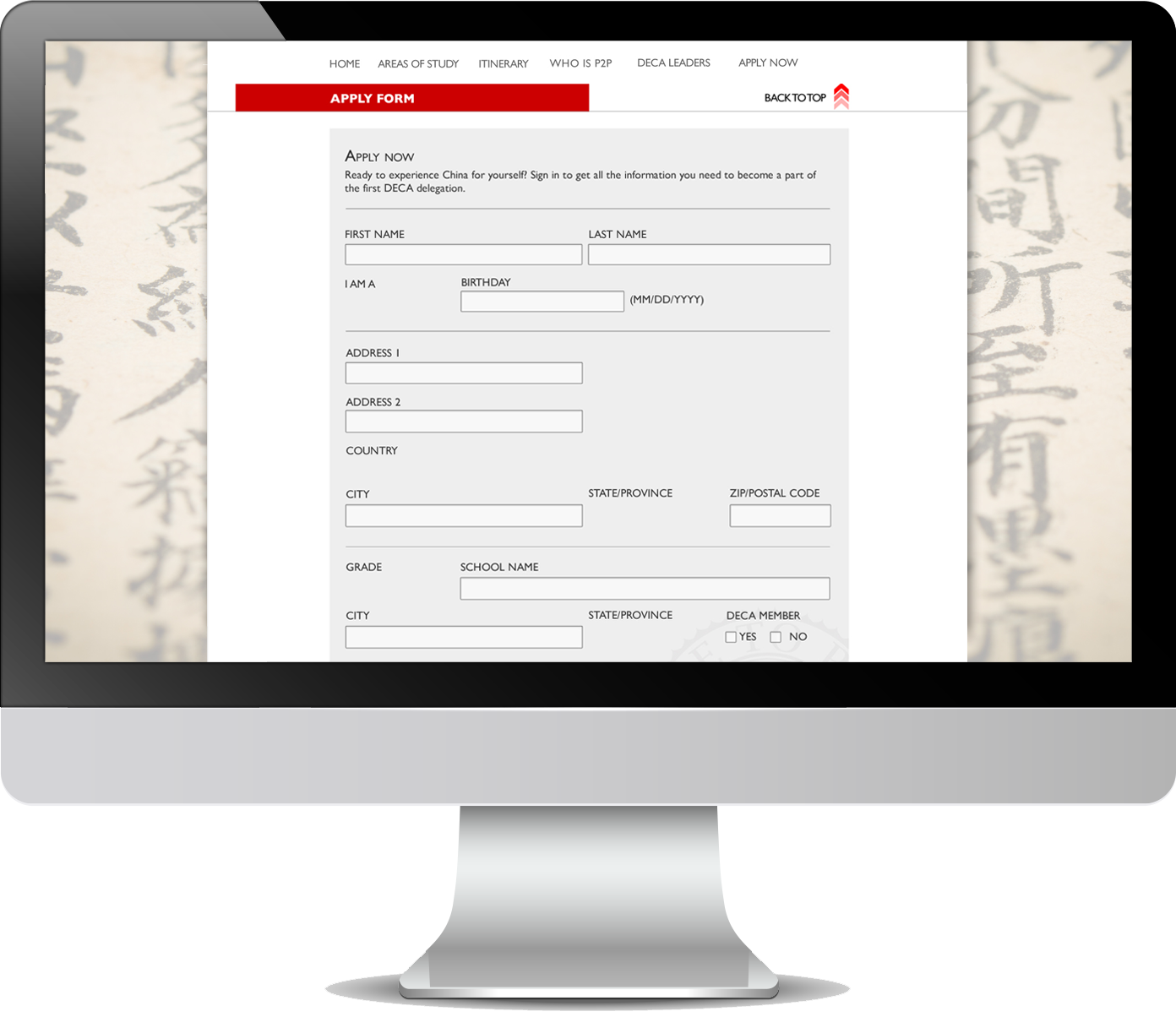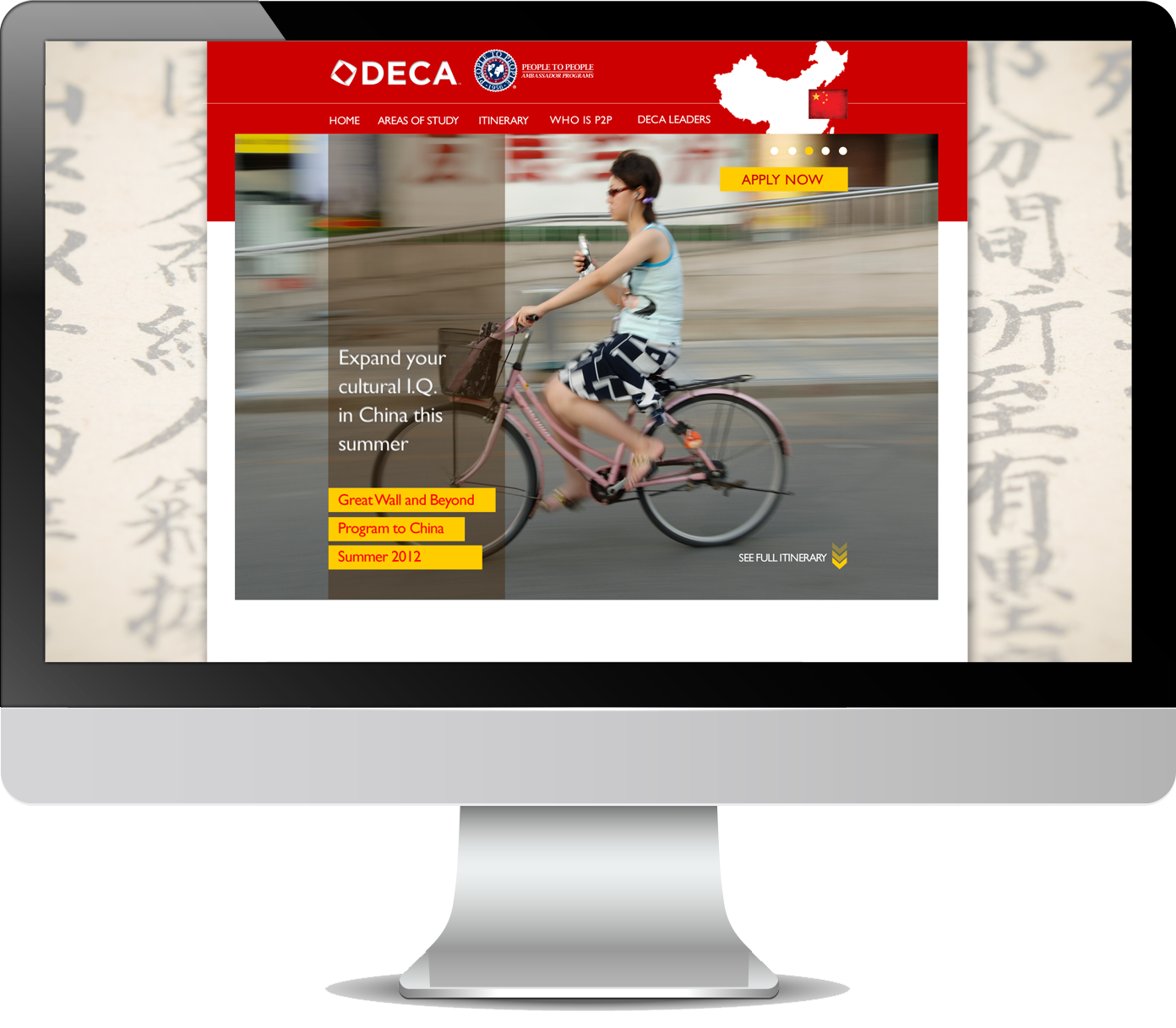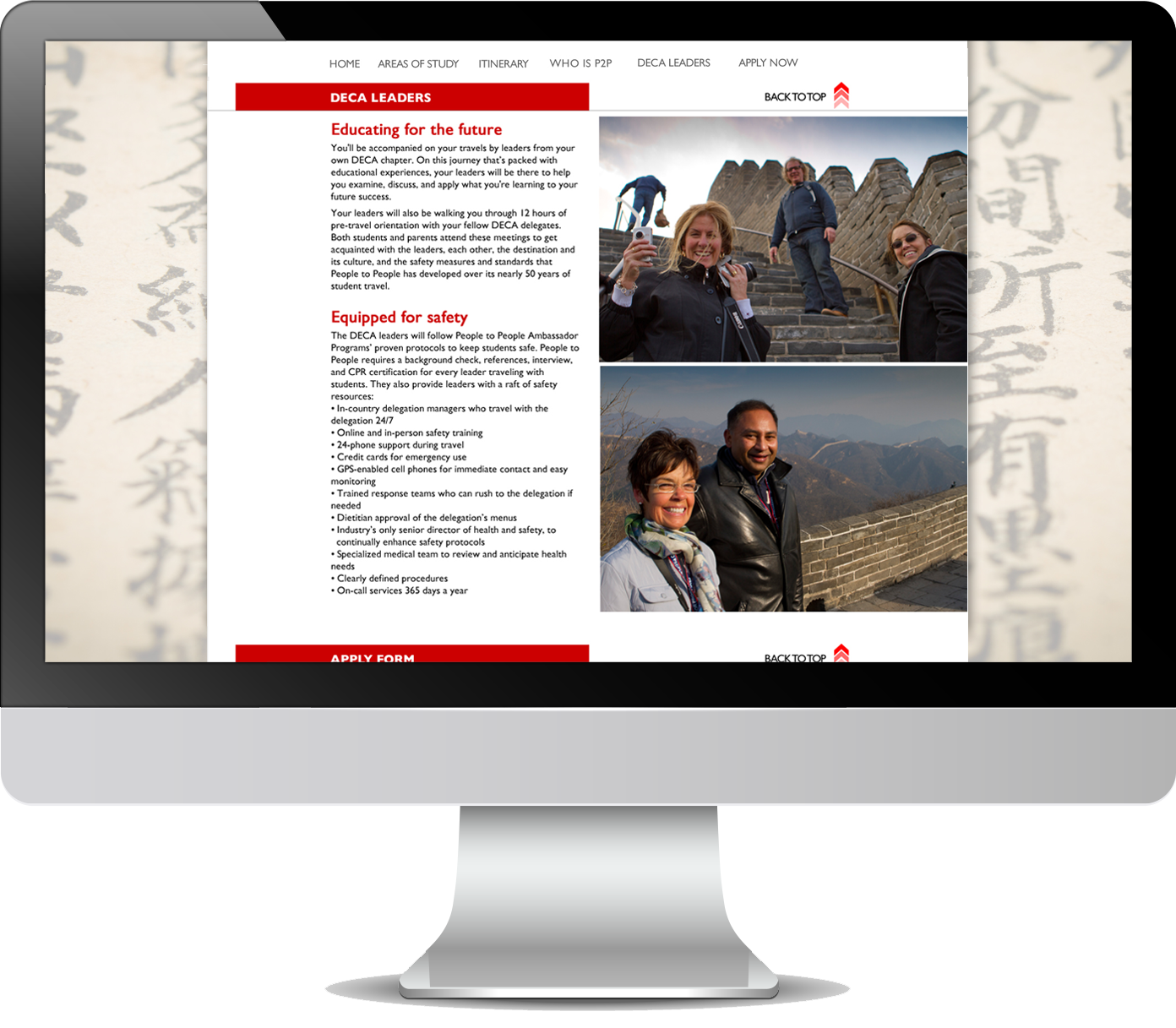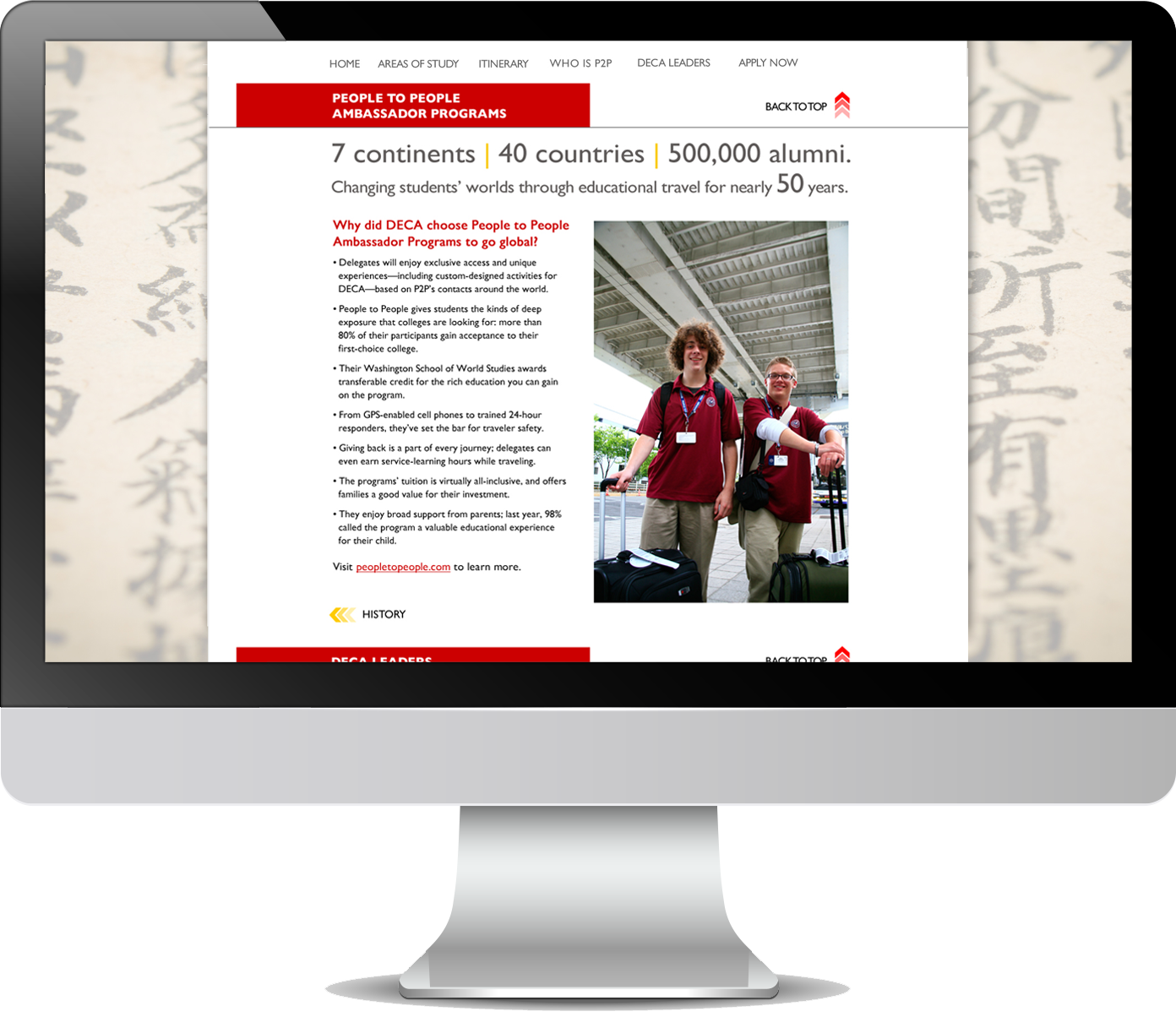 People to People Ambassador Programs partnered with DECA to provide DECA student-members their own customized educational travel program to China. Our client wanted the DECA partnership and promotional program to have its own look and feel that would set it apart from the traditional People to People offerings and website. This website was the first deliverable created for the partnership that set the unique, overall tonality for the promotion and partnership.